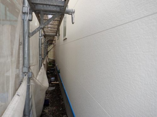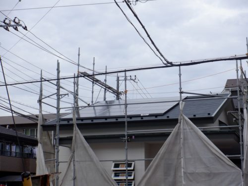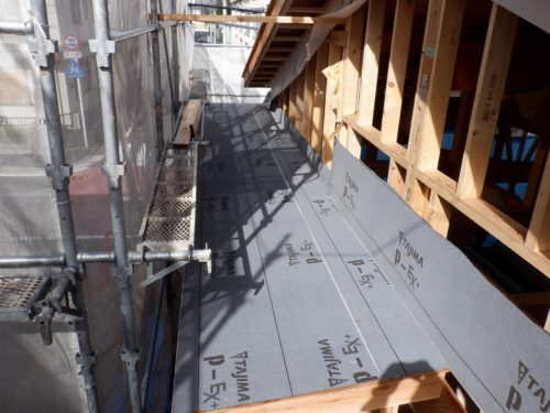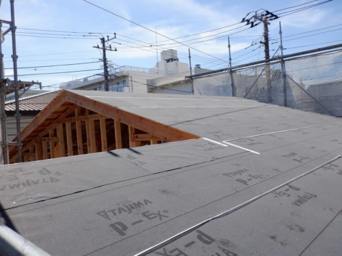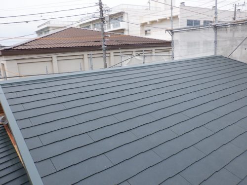 外壁との取り合いの頃合いを見てスレート屋根を張っていきます。
