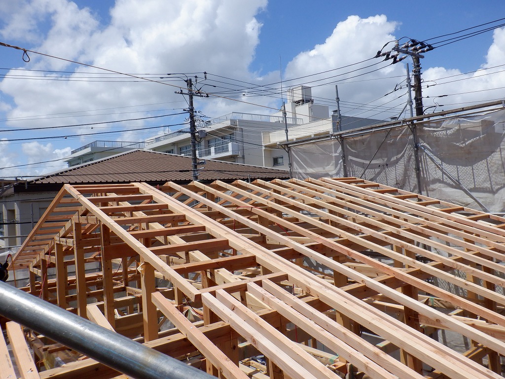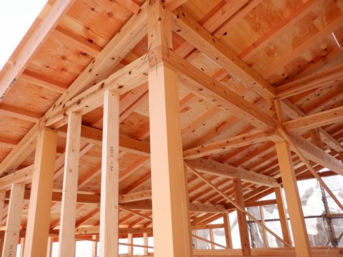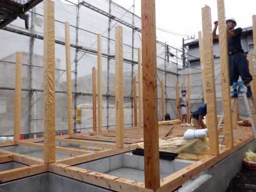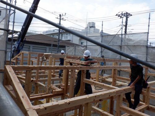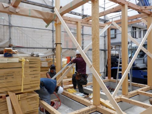 土台・柱・梁と繋ぎ合わせて組み立てて行きます。