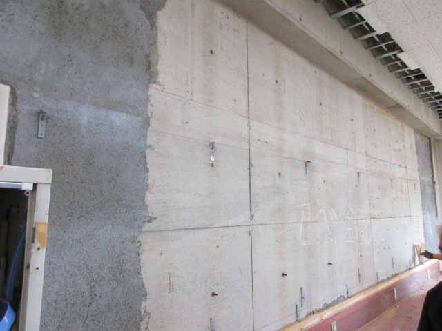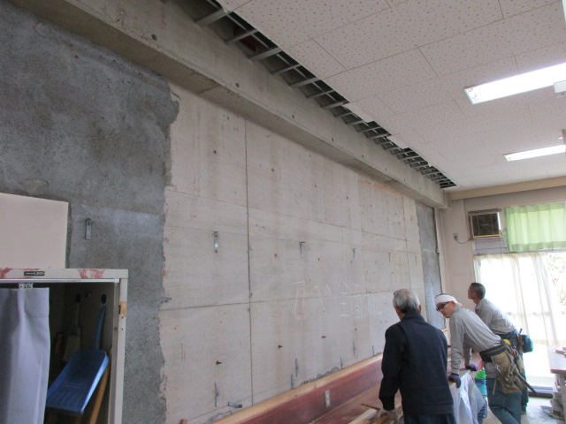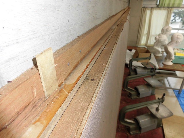 下記写真の壁、元々は上に木製吊戸棚が有り、下半面が掲示板でした。