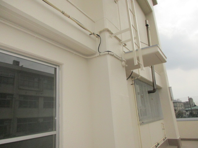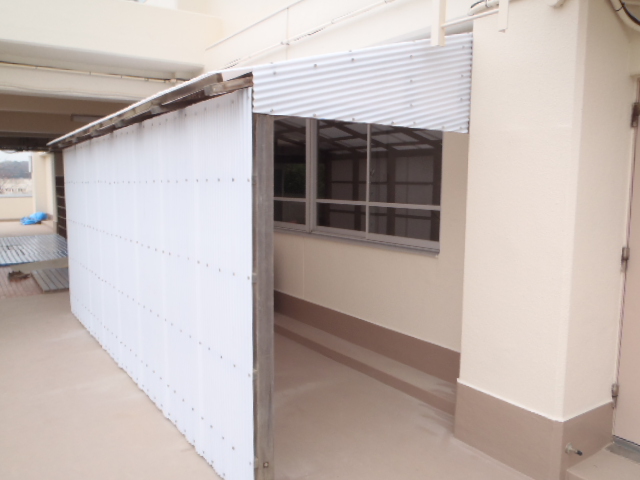 体育館の綺麗な外装に合う、真っ白な雨除けが完成です。