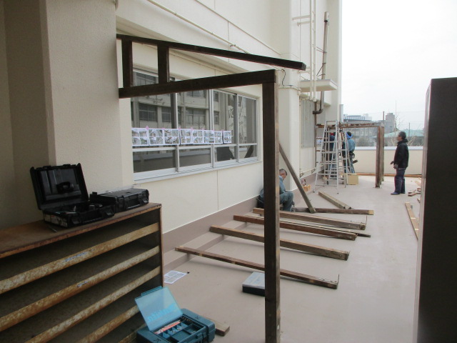 すっかりきれいに改修された体育館に以前の雨除けを取付けていきます。
