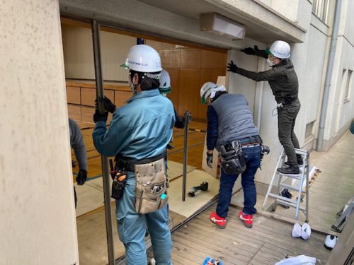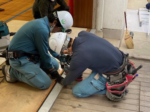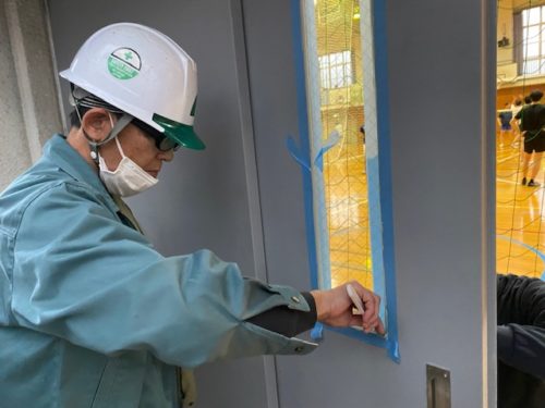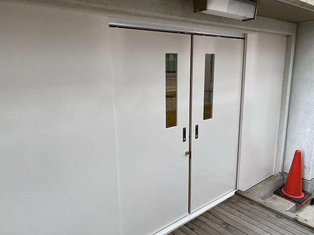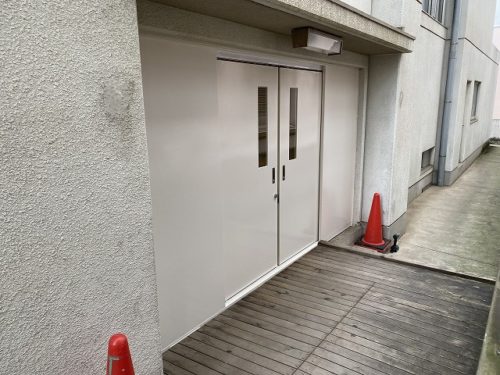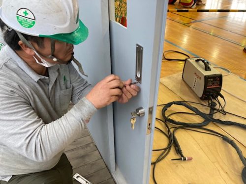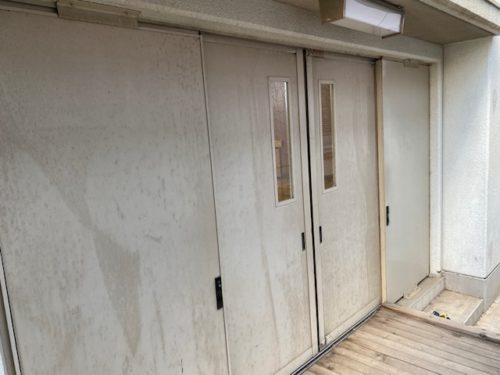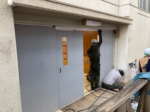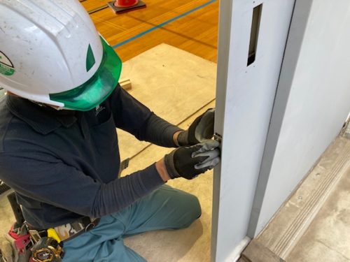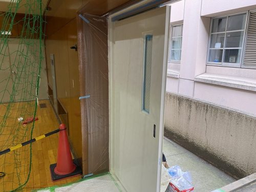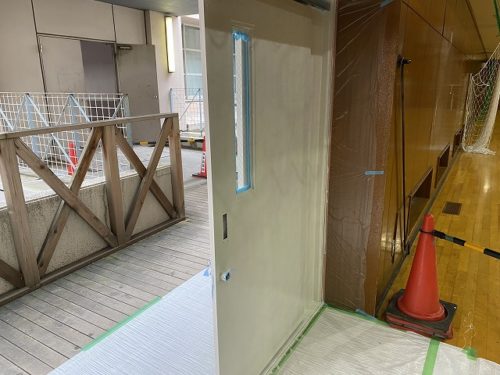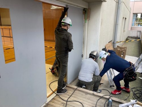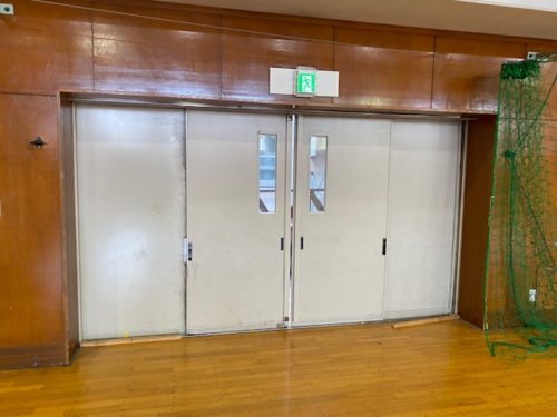 横浜市、某高等学校での「体育館出入口引き分け扉改修工事」です。