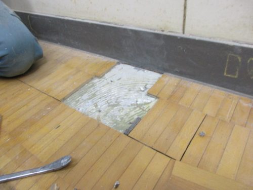 可動パーテーション固定箇所ギリギリの場所まで床材を剥がしていきます。