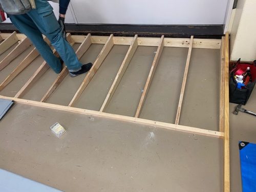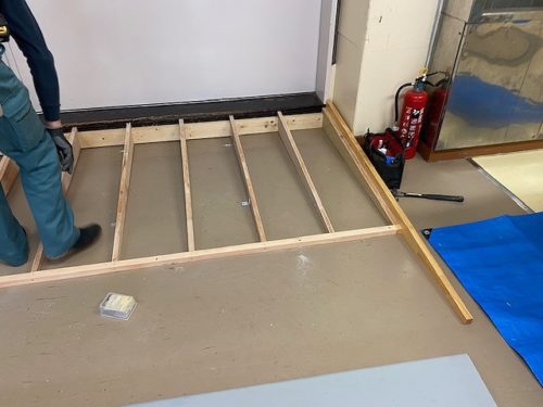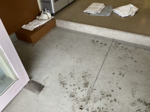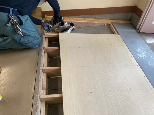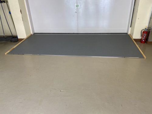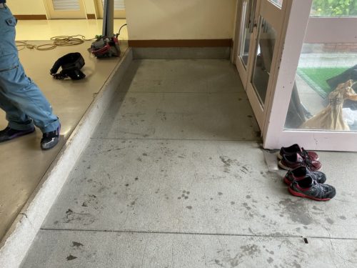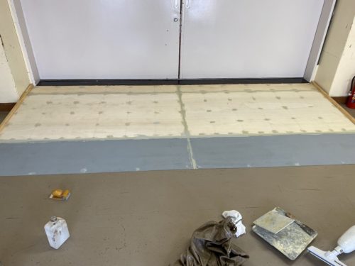 体育館に上がる前の段差にスロープを設置していきます。