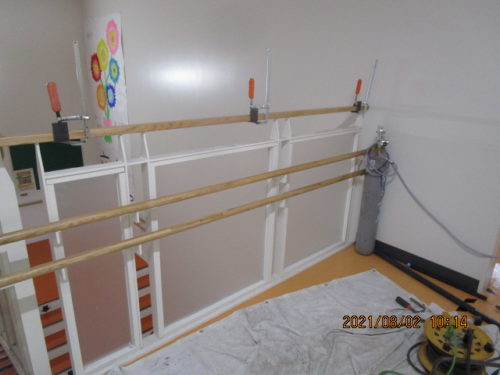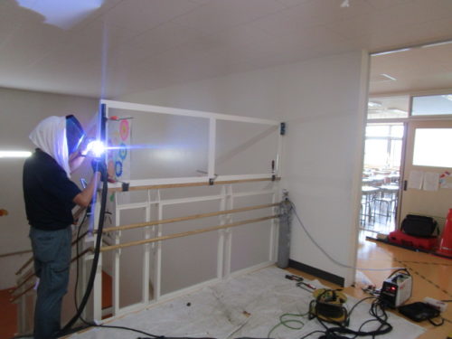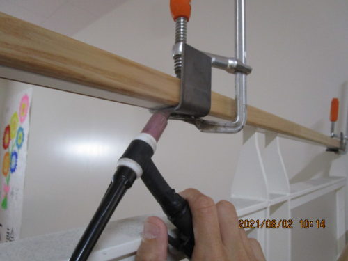 まずはパネルを固定するためのブラケットを手摺に溶接していきます。