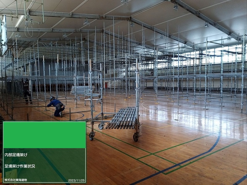 まず体育館内部に作業用の足場を掛けます。