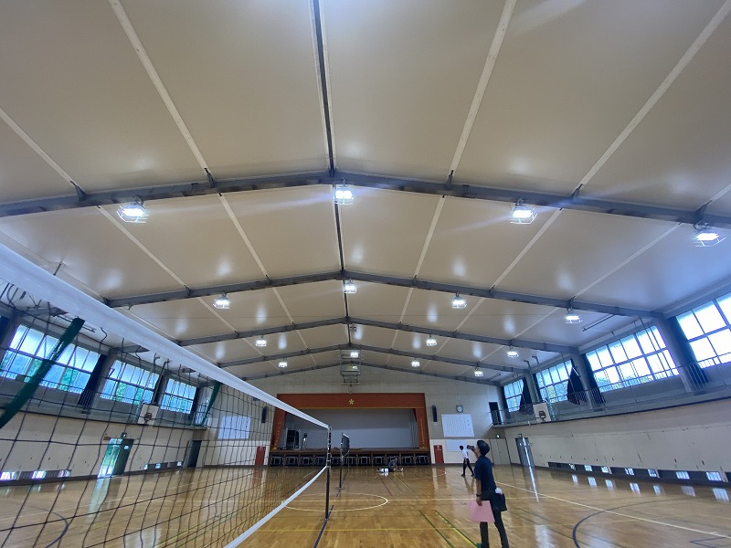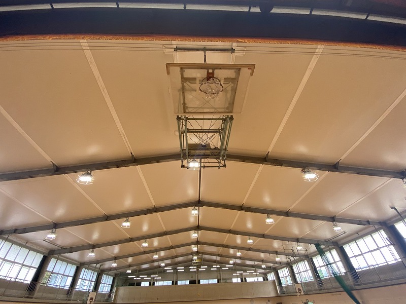 体育館内部に足場を掛けて屋根裏の断熱材の除去を行いました。