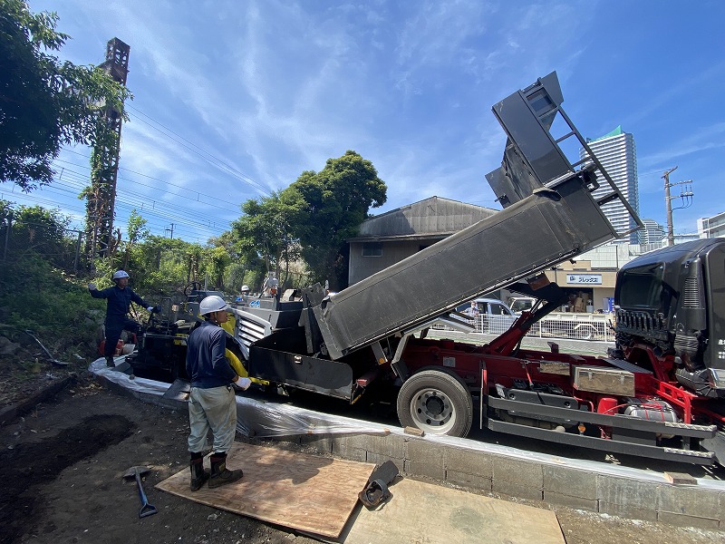 アスファルトフィニッシャーを用いて均一に敷いていきます。