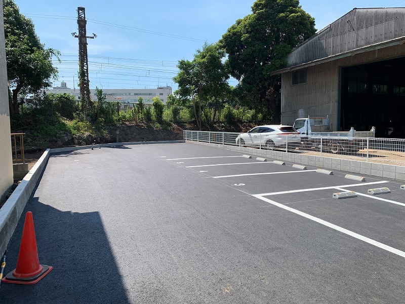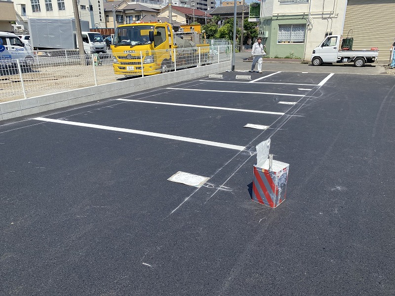 ②舗装工事…駐車場として使えるよう、アスファルト舗装を行い、車止めの配置や白線を引きます。