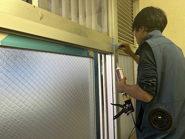 最後に扉にガラスとパネルをはめ込み廻り縁にシーリングを打ち込み工事は完了です。
