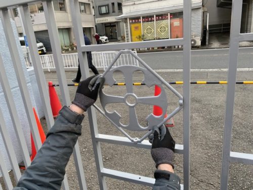 今回、学校様の希望により、門扉に取り付けられていた鋳物のエンブレムを移設する為、