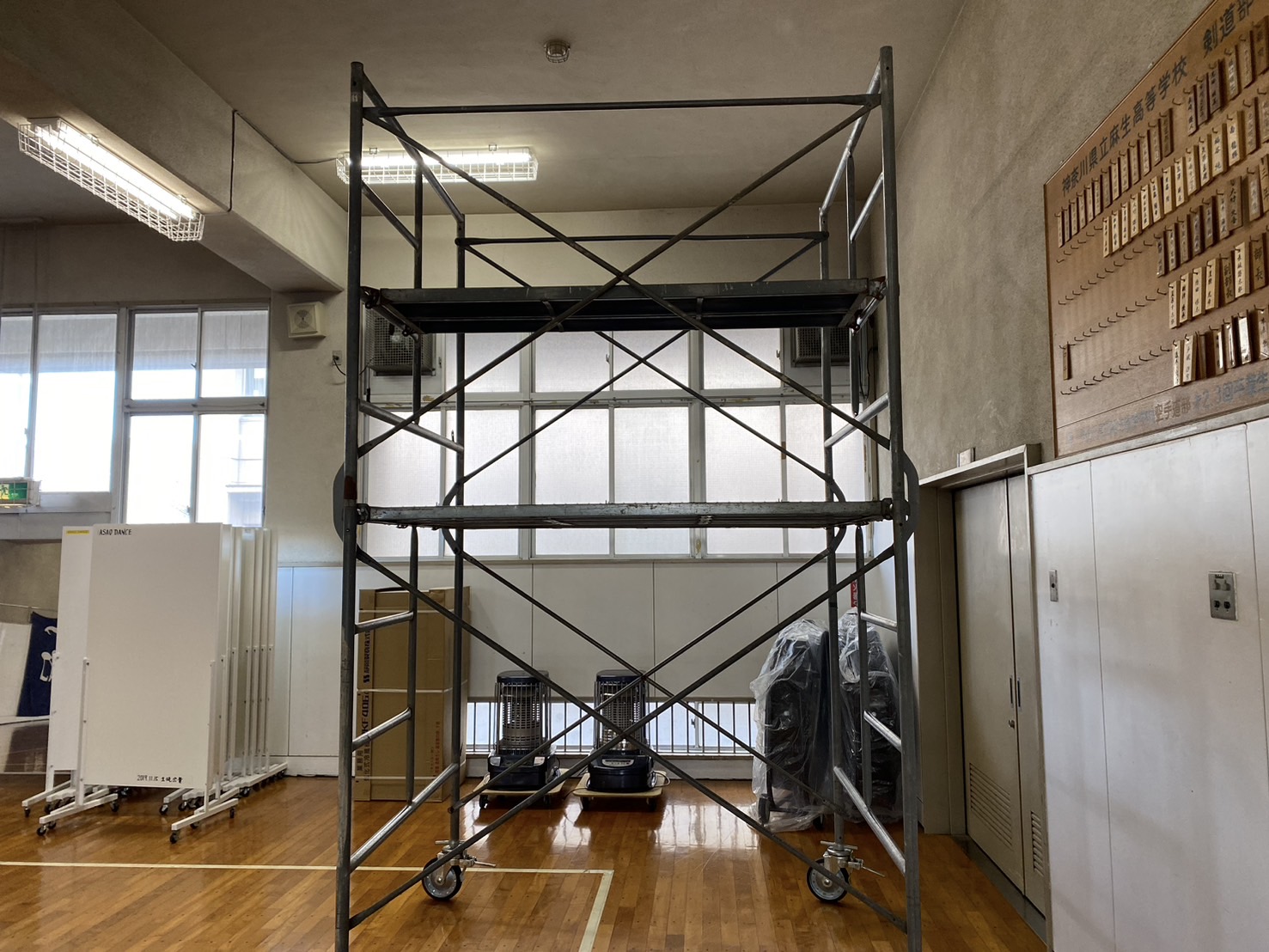 作業箇所が格技場天井のため、高所の作業となりますので、まず作業用の足場を立てます。