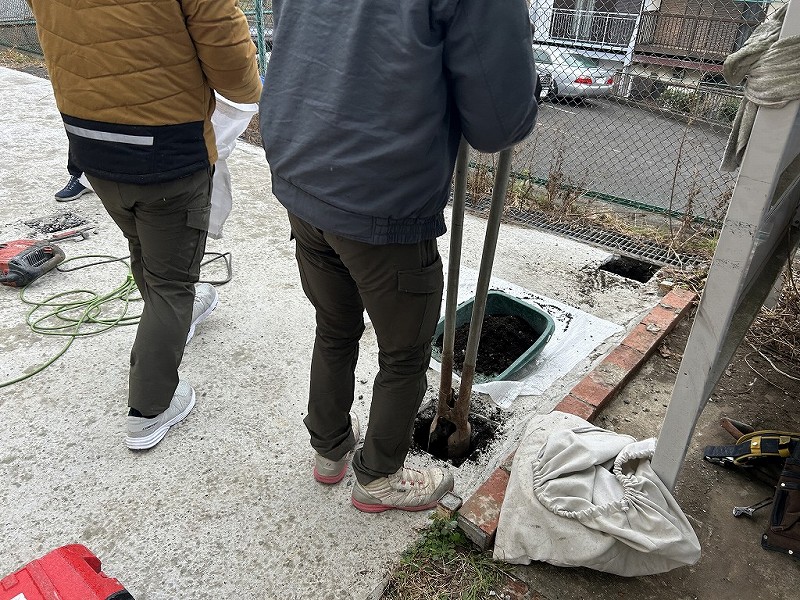 今回の自転車置き場の柱を埋め込む為に深さ50㎝ほど掘りました!!