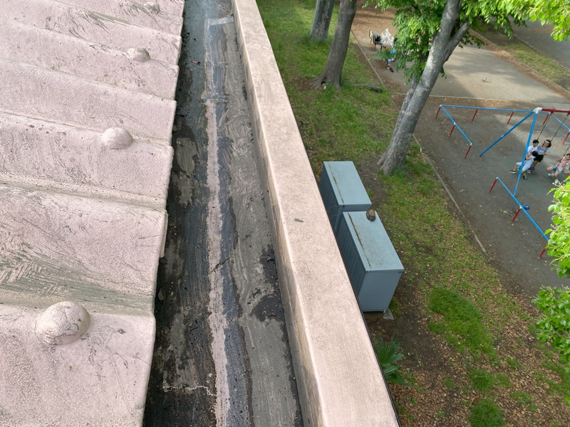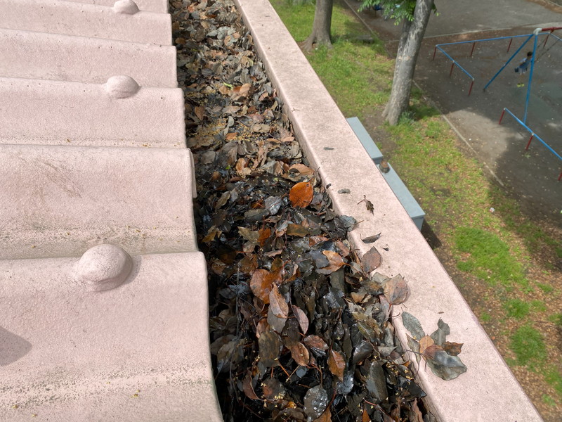 画像のように体育館雨樋が枯葉や土で埋もれ、雨水の排水ができずに水が溜まってしまう状態でした。