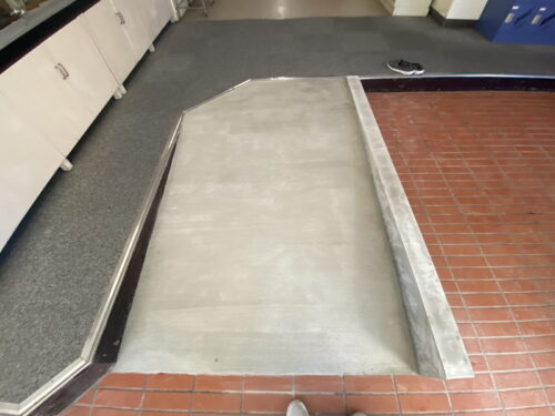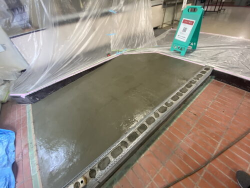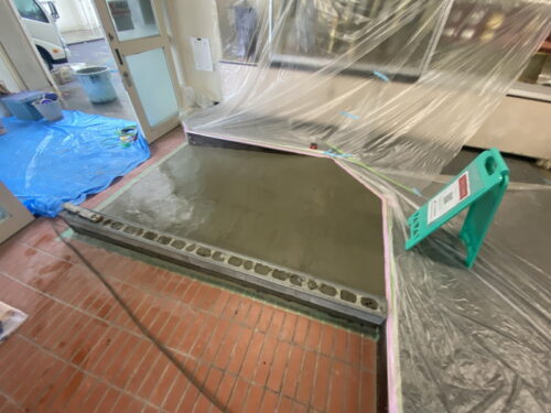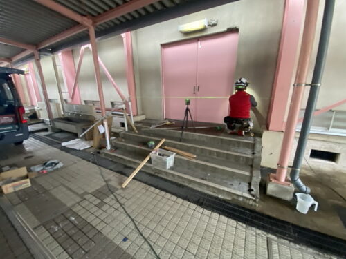 既存床タイルを部分的にはがし、コンクリートを打って左官にてスロープを作っていきます。
