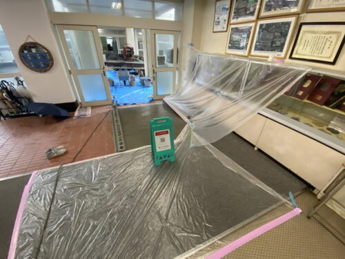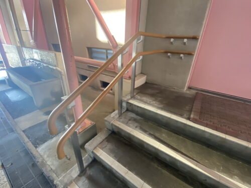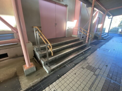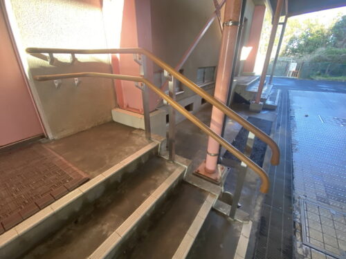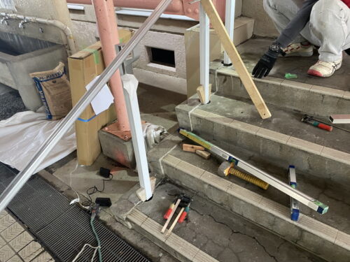 合わせて体育館出入口前の階段には両側に手摺を取り付けていきます。
