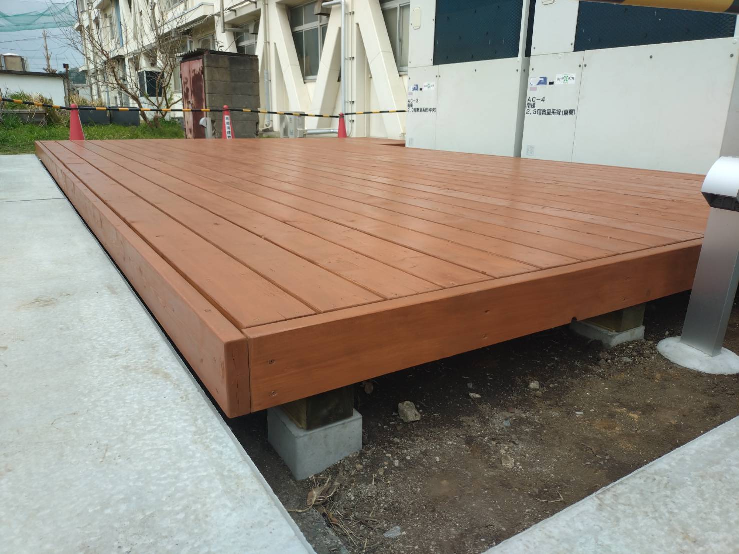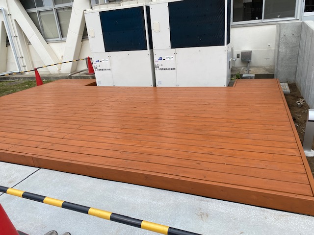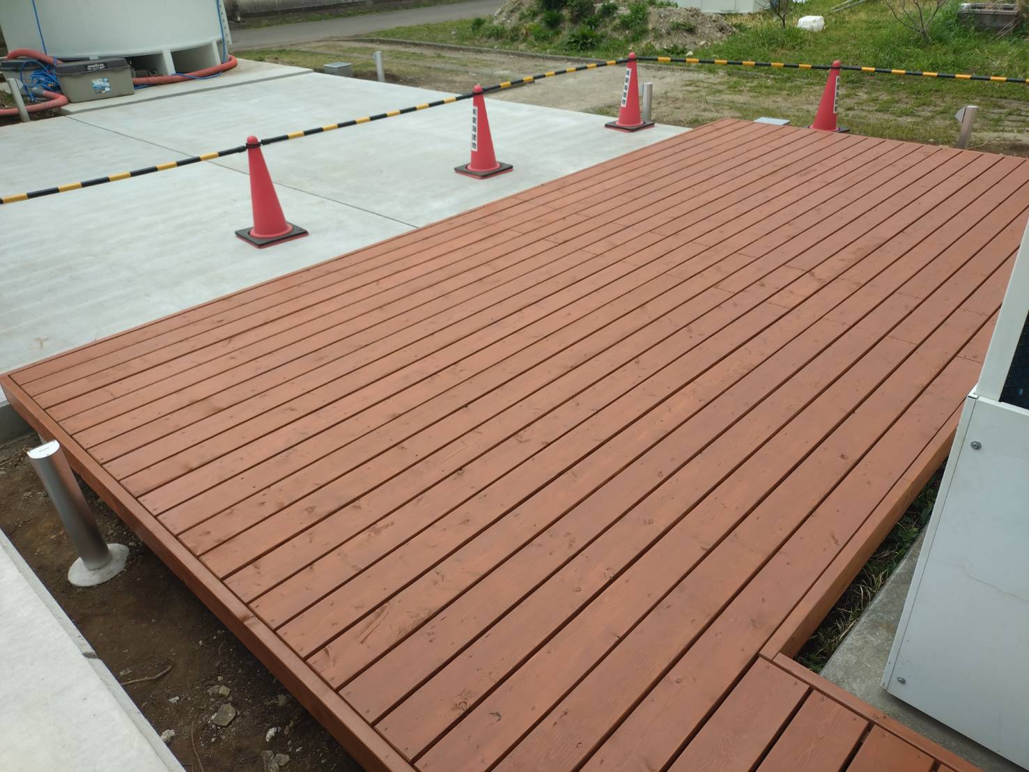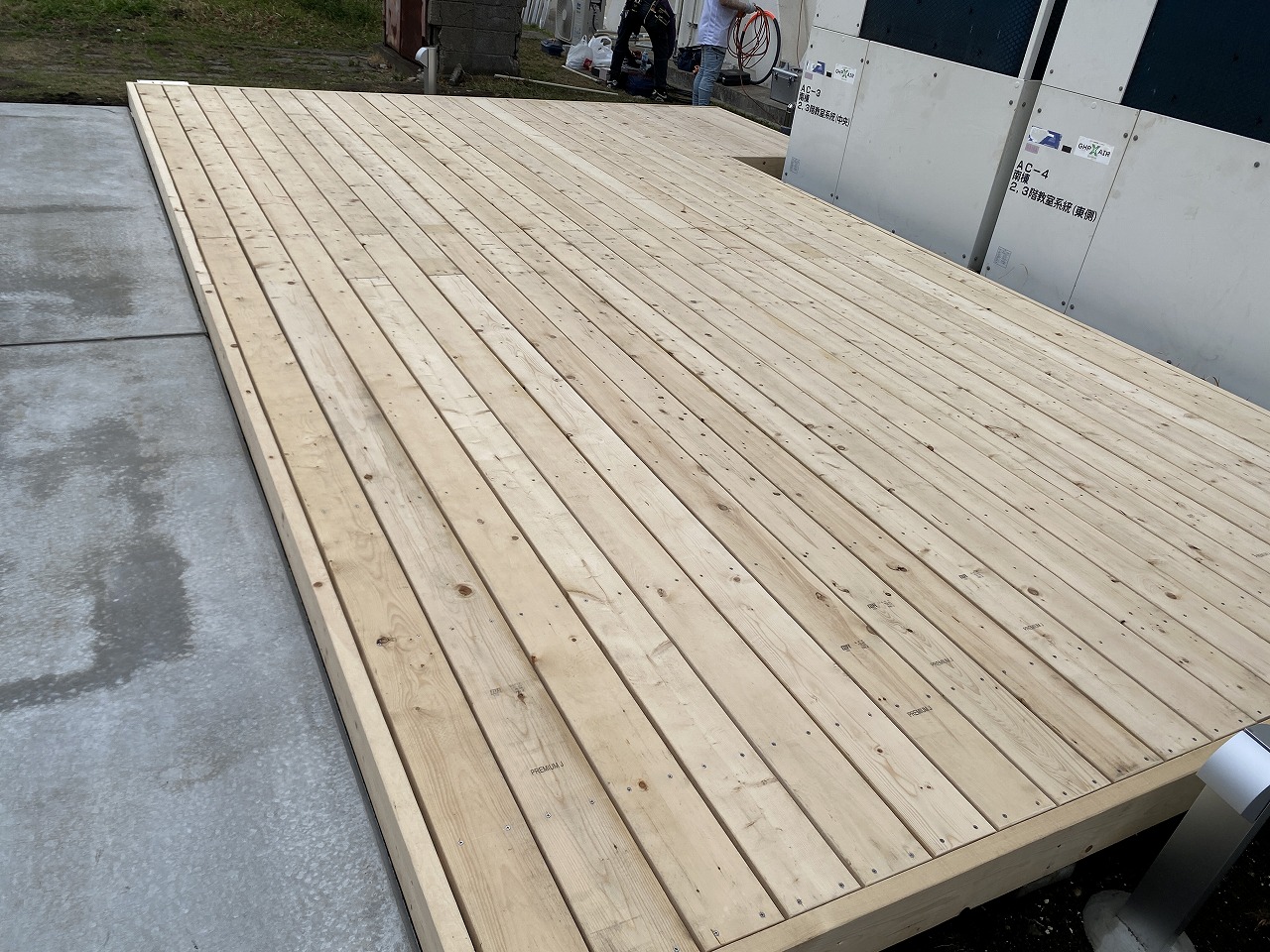 今回は防腐剤を注入加工しておりますが、正規のデッキ材と比べ材質的に柔らかく