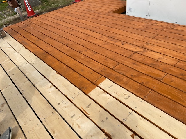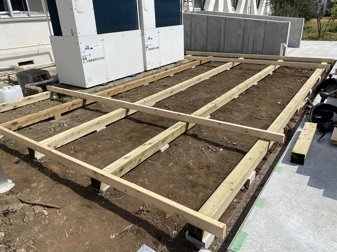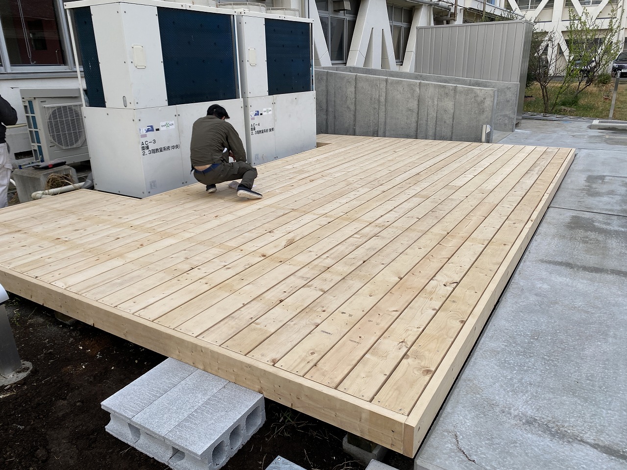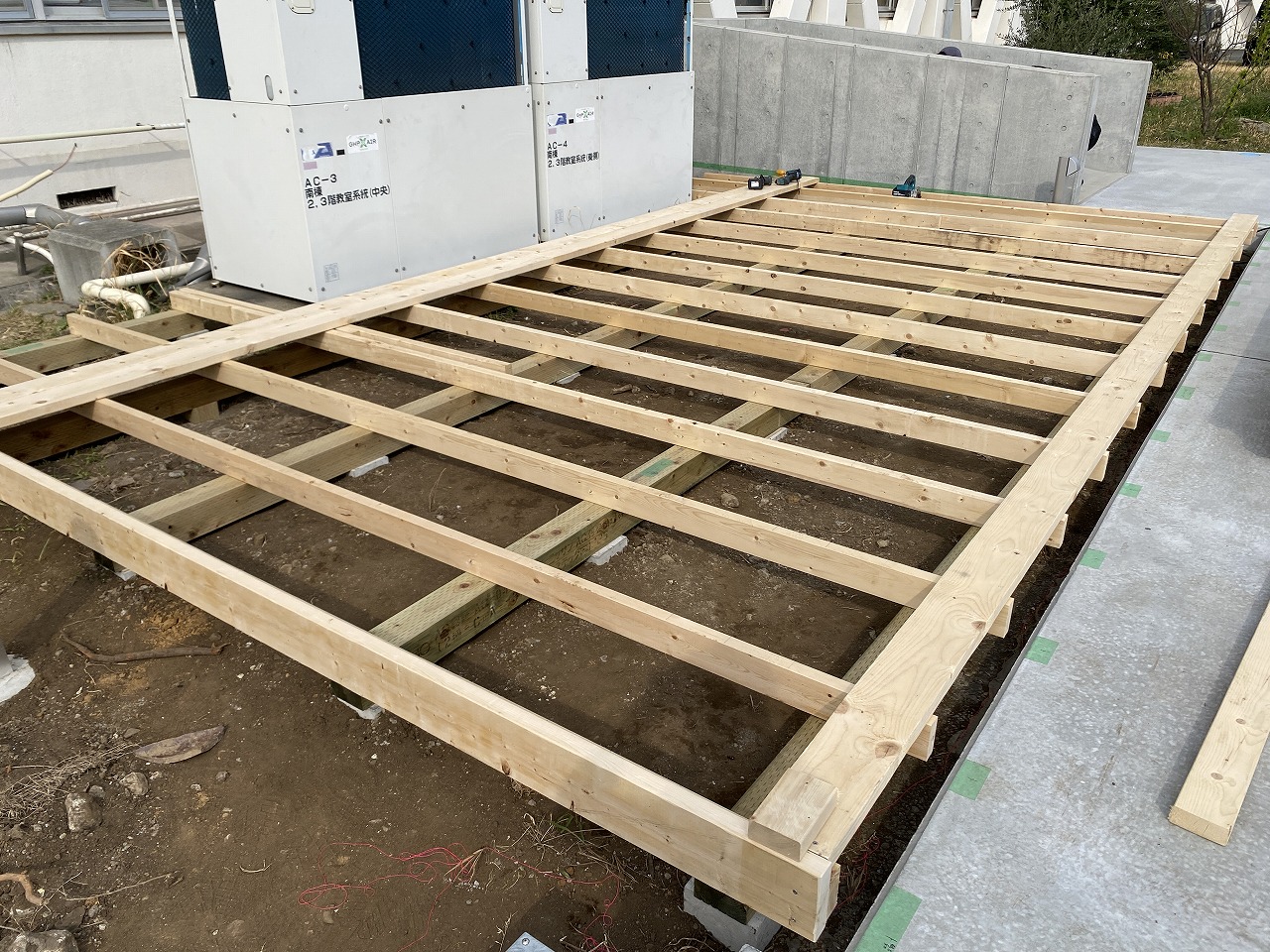 今回は防腐剤を注入加工しておりますが、正規のデッキ材と比べ材質的に柔らかく