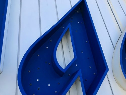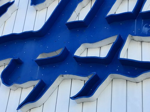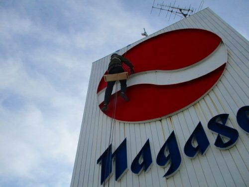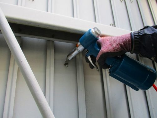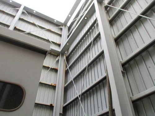 内側からスパンドレルと板金看板を結合し補強する方法に決定です