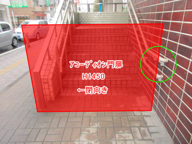 こちらにもアコーディオン扉を設置。緑丸部分の手摺は扉に当たってしまう為に切り取ります。