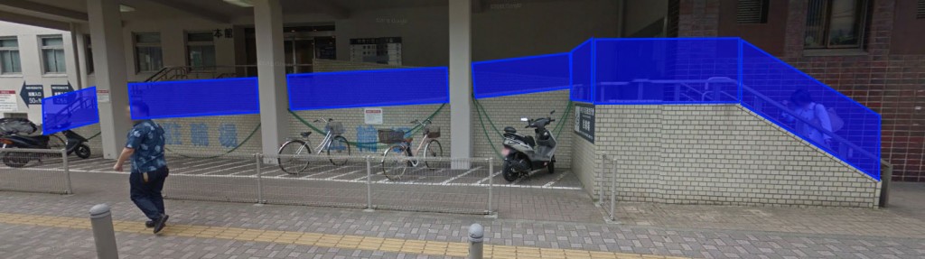 手前腰壁の嵩上げとして青色部分にH600フェンスを設置。