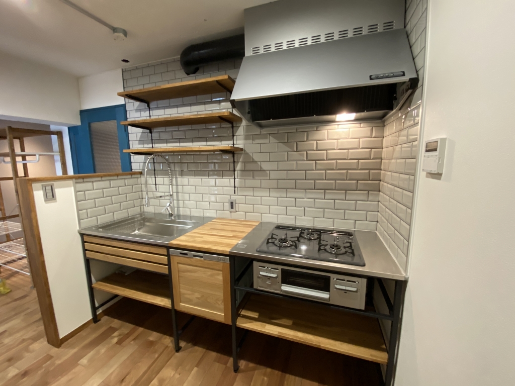 アイアンフレームに集成材を加工したカップボードと吊り棚を取り付けました(^_^)/