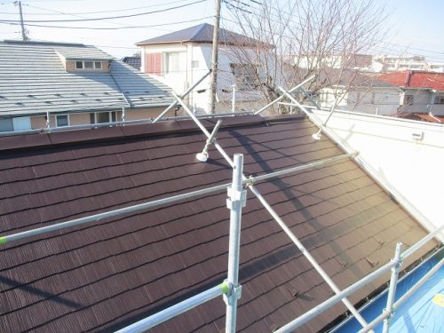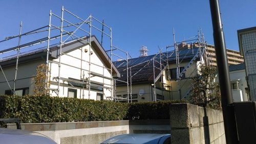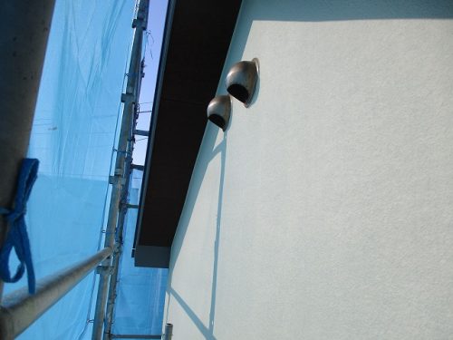 足場を架け屋根・外壁廻りの塗装工事を行いました。