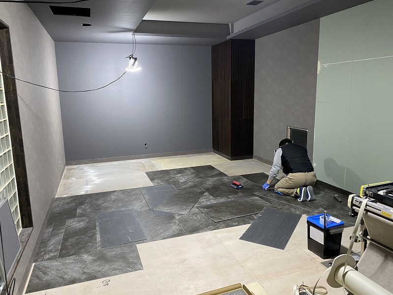 床の仕上げに塩ビタイル(フロアタイル)を貼ります。