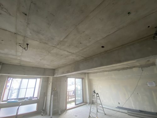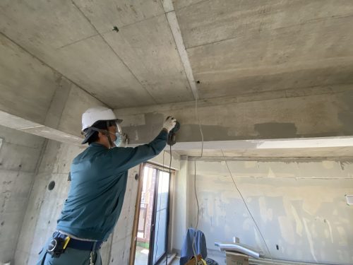 天井もあらわし仕上げですのでコンクリート面を素地調整します。