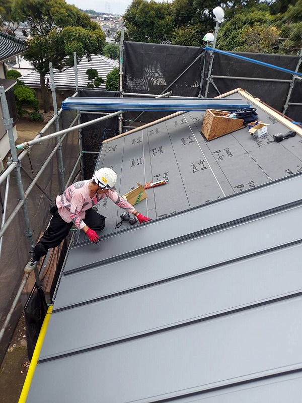 ルーフィング工事です。屋根の防水を目的とした、ルーフィングシートと呼ばれるものを貼付けます。下葺き材と呼ばれることもあります。