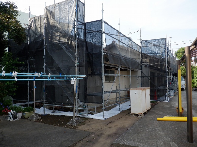 まず、足場工事から行いました。塗装工事や葺き替え工事をするために必須工事です。