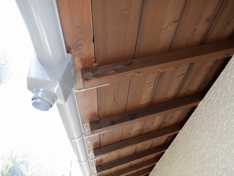 最後に樋工事です。経年劣化が大きく見られたため、こちらも新たなものに取り替えました。屋根材の色にあった雨樋を取り付けさせていただきました。