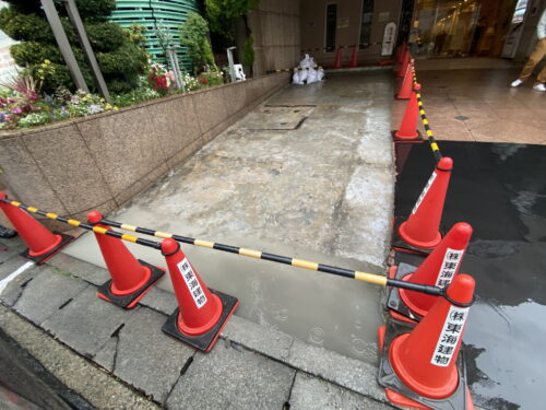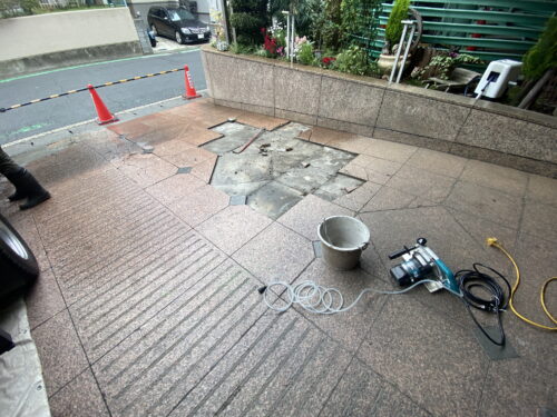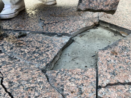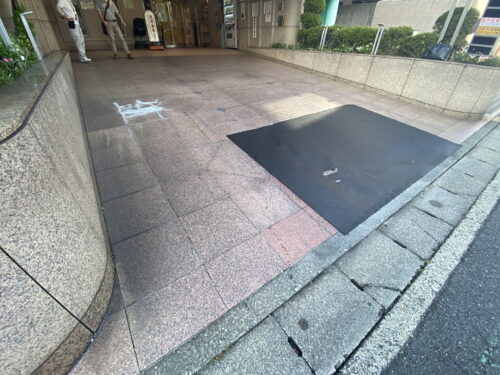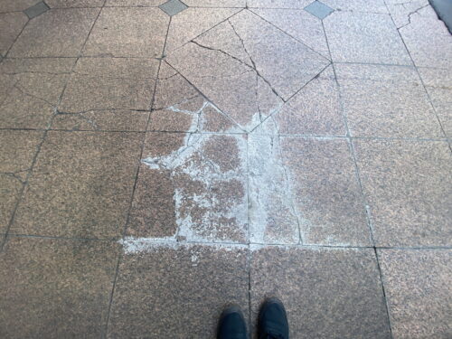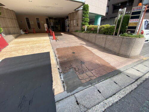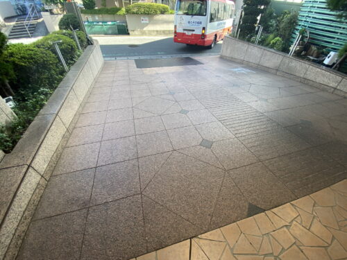 このスロープには送迎用のバスやタクシーも入るのですが写真の通り面材の石材タイルが車両乗り入れで