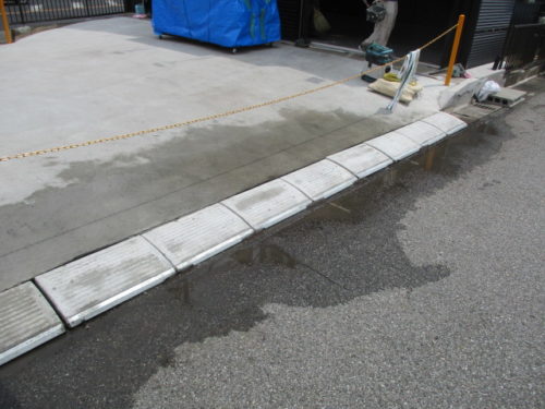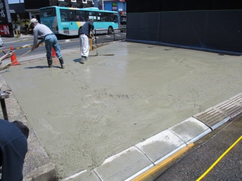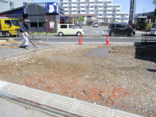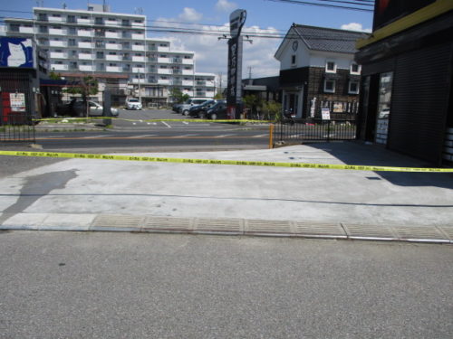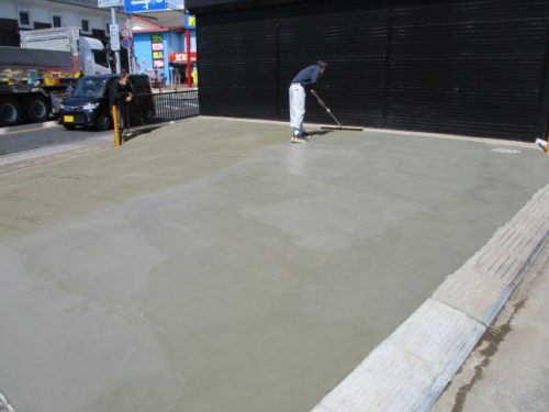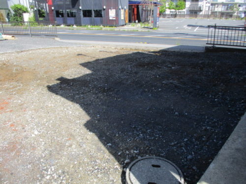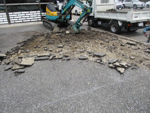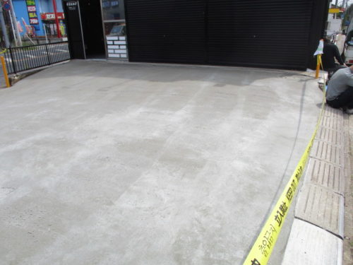 床が傷ついてしまう事が起こったために店舗前のアスファルトを部分撤去し、コンクリートを打設いたしました。