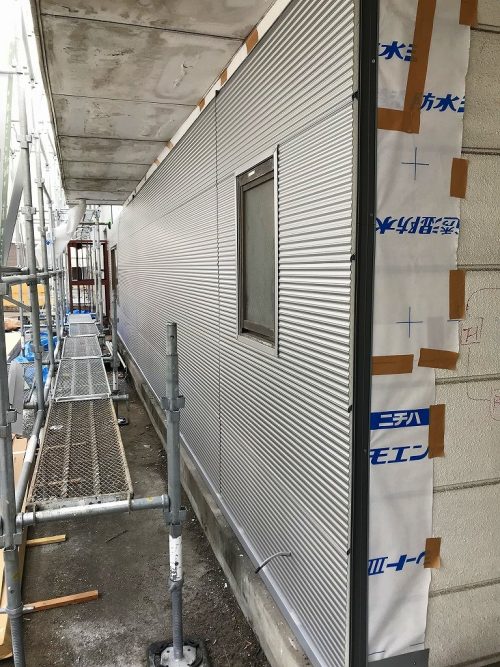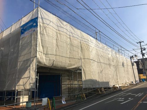 外部では同時進行で足場を建てて