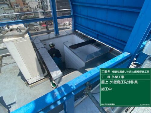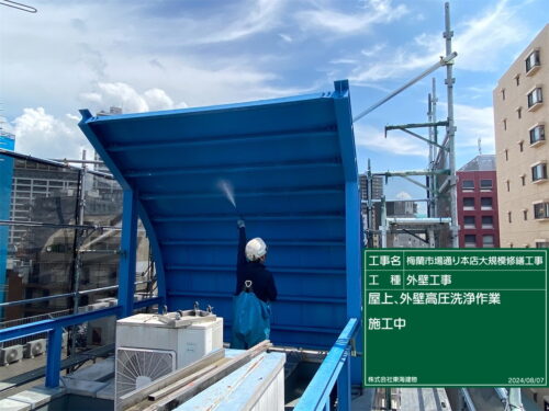 鉄製屋根、鉄骨、屋上床、タイル外壁、ALC外壁と洗っていきます。