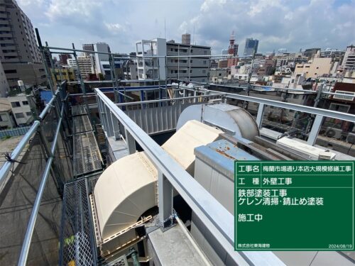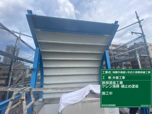 鉄製屋根と鉄骨、ダクトなど鉄部の塗装を開始しました。