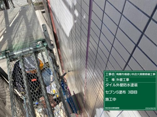 作業は続き、タイル外壁面の防水作業、
