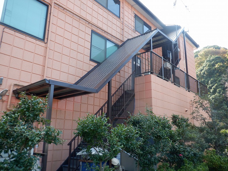 横浜市戸塚区外部階段 屋根改修工事 ポリカ屋根→板金屋根