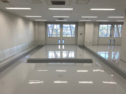 撤去後の床はPタイルでしたので、こちらも全面撤去し、樹脂モルタルを使用して下地調整を行います。